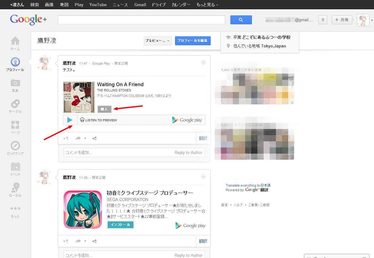サークル内の人が共有した曲の一覧が表示されるようになっています。ここから曲を選んで[Share]-[Share Song(sample)]をクリックすると、Google+へ投稿ができ……